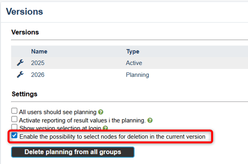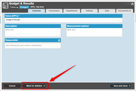 In the planning version, this function is used to mark information that should be removed during version management. This may include goals or measures that the organization has chosen not to continue working with in the upcoming period.