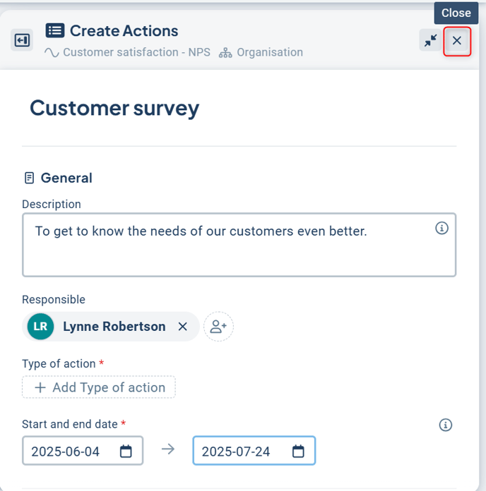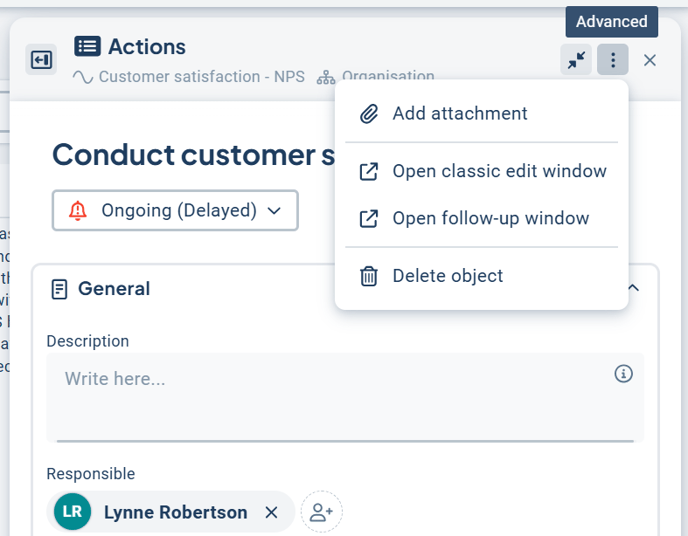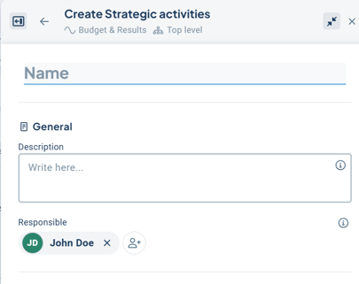 In the object window, all settings are displayed on a single page, eliminating the need to switch between tabs to access different options. This window is organized into sections for your convenience. The first section, "General," includes the name of the object and typically features several fields related to the type of activity you wish to add. Examples of these fields may include a description, desired outcome, participants, and more. If your organization assigns responsibilities, this is also where you will define who is responsible for the activity.