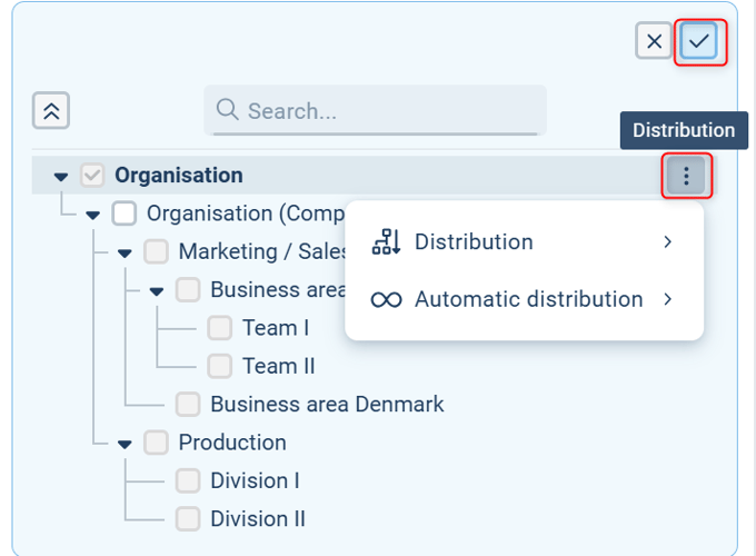 Automatic distribution means that when new units are added to the organizational hierarchy below your level, these units will automatically be assigned the activity. This feature is particularly useful for activities that are relevant to a whole branch of the organization. You can enable automatic distribution in the same way as illustrated in the previous section.