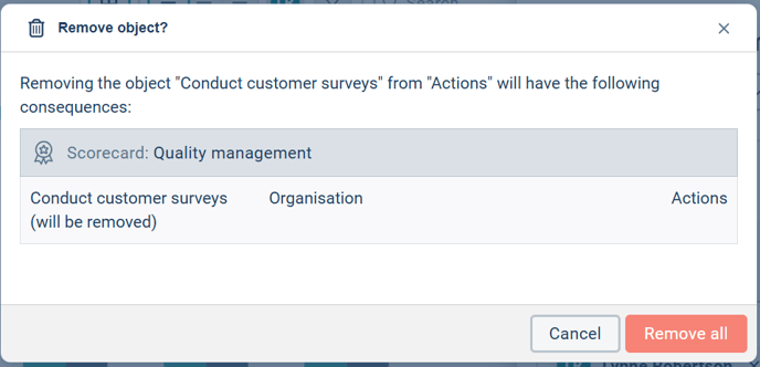 You will then receive a summary of the implications of the deletion. To proceed with removing the object, you need to click on "Remove all," as shown in the image below.