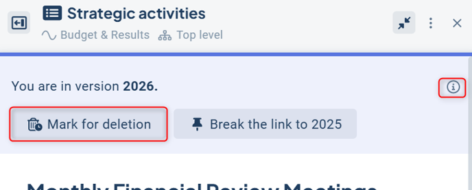 If you are working in the planning version, you will first have the option to mark the activity for deletion. Activities that are marked for deletion will automatically be removed during the versioning process. If you wish to delete an activity immediately without waiting for versioning, you can reopen the marked object and delete it using the three-dot menu as described earlier. This action will remove the object from the planning version while still retaining it in the current version.