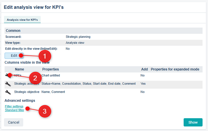 You can set filter settings and standard filters for what should be displayed in the view under Advanced Settings in the lower left corner (3).