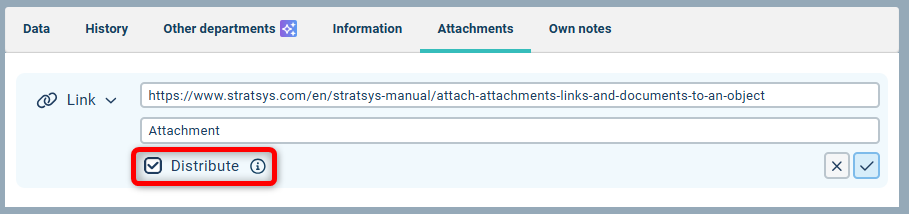 When adding an attachment, you can choose whether underlying departments should have access to it using the “Distribute” property.