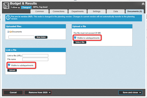 For files and links that are uploaded, you can choose whether they should also be visible to underlying departments. If the property is not visible, it is not possible to enable downward visibility—see the sections above for applicable rules.