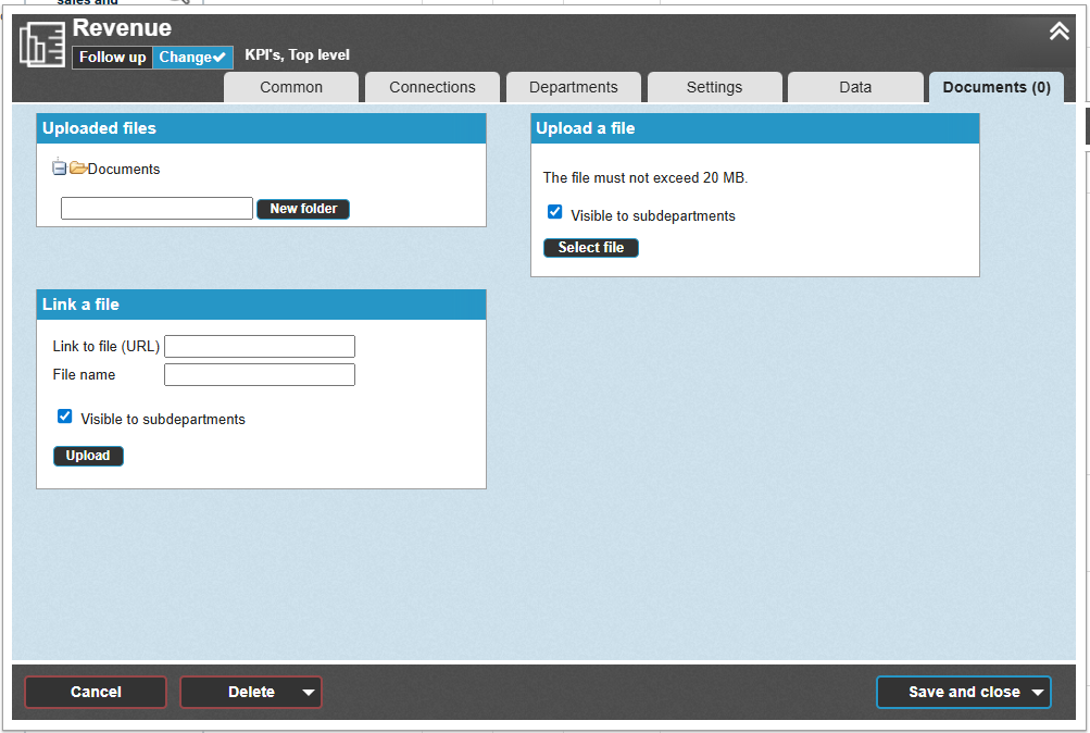 For measure and activity objects, there is a global setting to restrict the addition of links and documents to the top level only. These attachments will then always be visible on all underlying levels. With this setting enabled, the ability to individually manage the downward visibility of documents and links is removed.