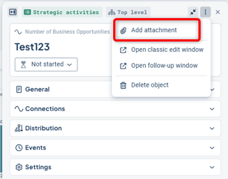In the object window, you can add attachments by selecting this menu option from the three-dot menu in the top right corner.