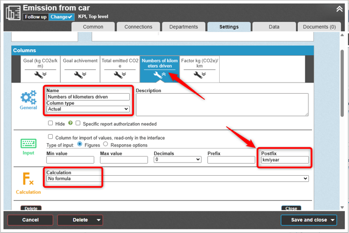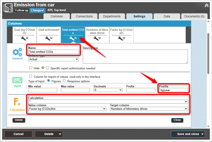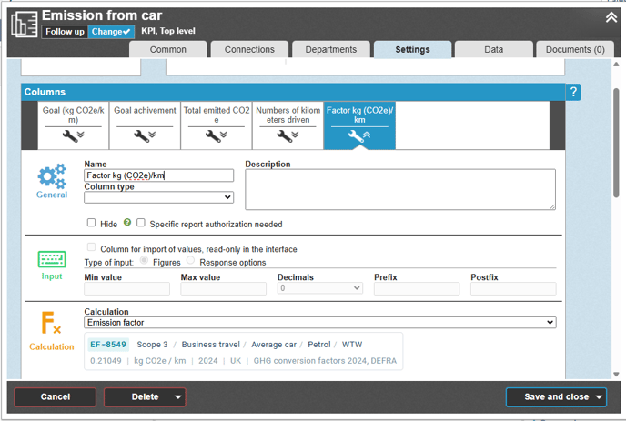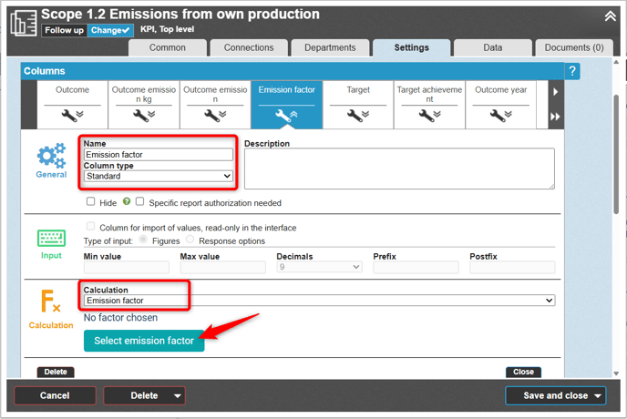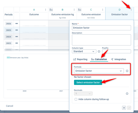 You can name the measure column for the emission factor as you wish. Use the column type "Standard". The column will automatically be read-only, and the number of decimals will be adjusted automatically when you save.