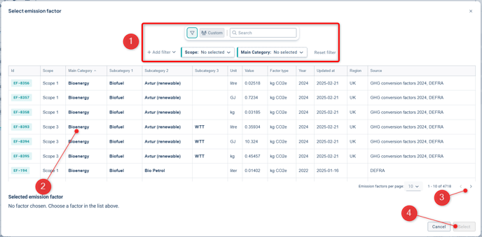 Select Emission Factor. In the catalog view, you can search and filter the view (1), click a row to select a factor (2), browse additional pages if needed (3), and save the selected factor to your measure column (4).
