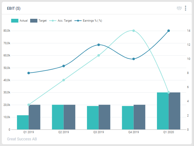 Below is an example with four measure columns, three of which are shown as thousands of dollars on the left scale and the last as a percentage on the right scale. The chart displays five visible periods.