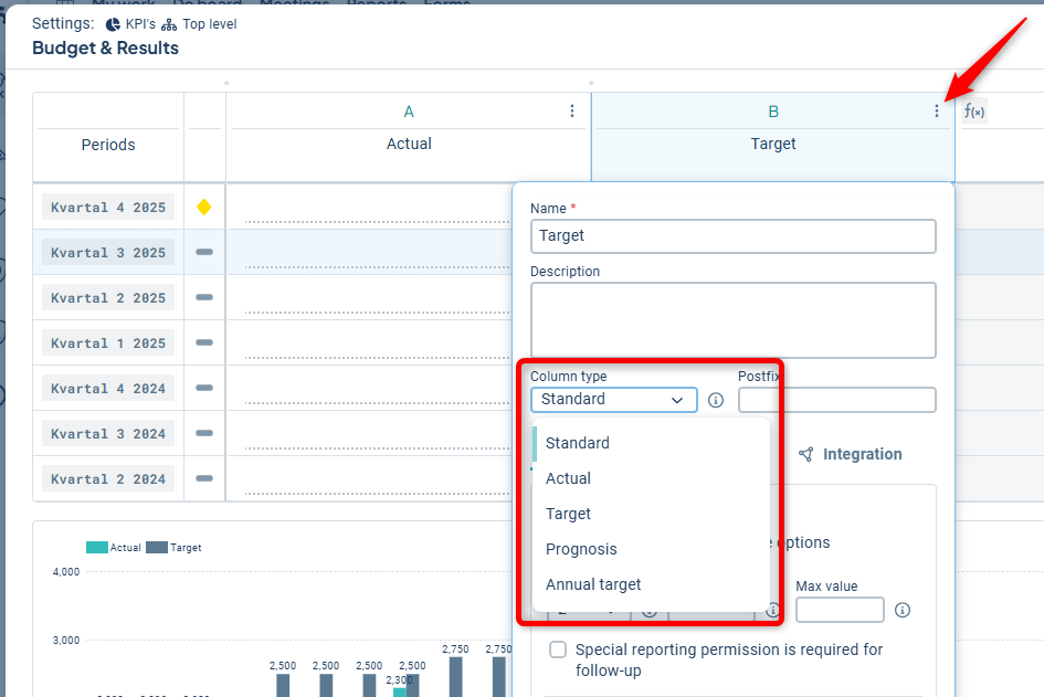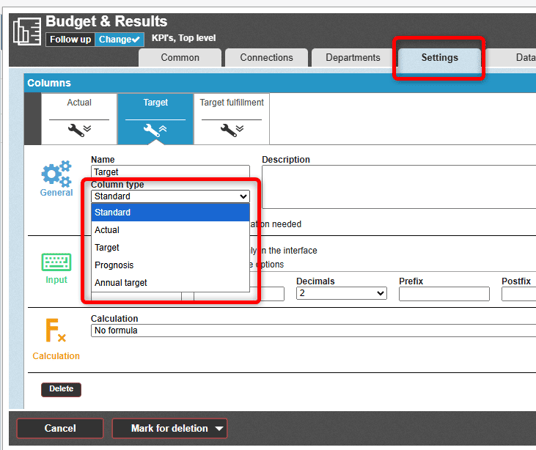 The column types determine which responsibility role is accountable for which types of data entries. For example, one role might be responsible for reporting target values, while another handles actual values.