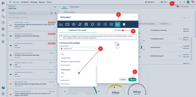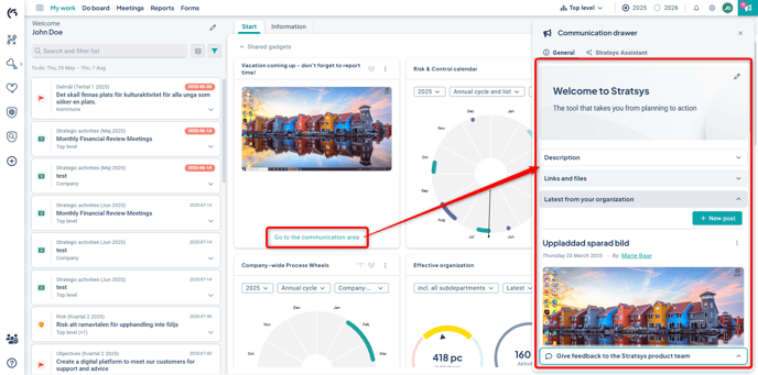 As an administrator, you first create the post you want to present in the Communication Drawer. Create the post either under the section "Latest from your organization" or "Instructions".