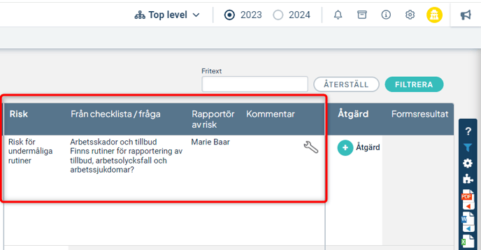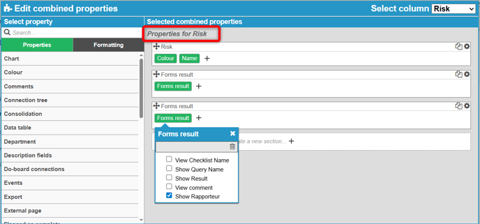 You can visualize information from the checklist in views and reports for the risks and actions created using the Forms results node property.
