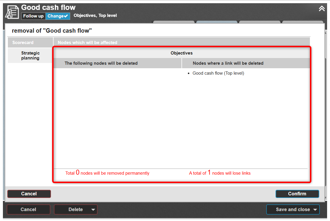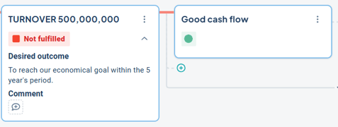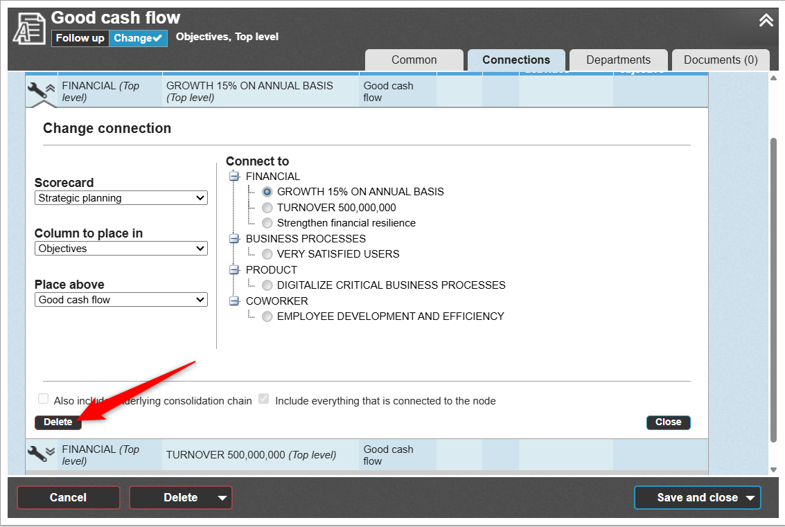 Illustrative example: The objective "Good cash flow" is linked to both strategic objective "Growth 15% on annual basis" and "Turnover 500,000,000" and therefore appears twice in the view.