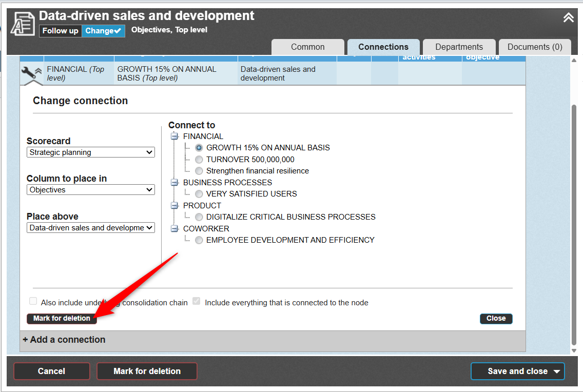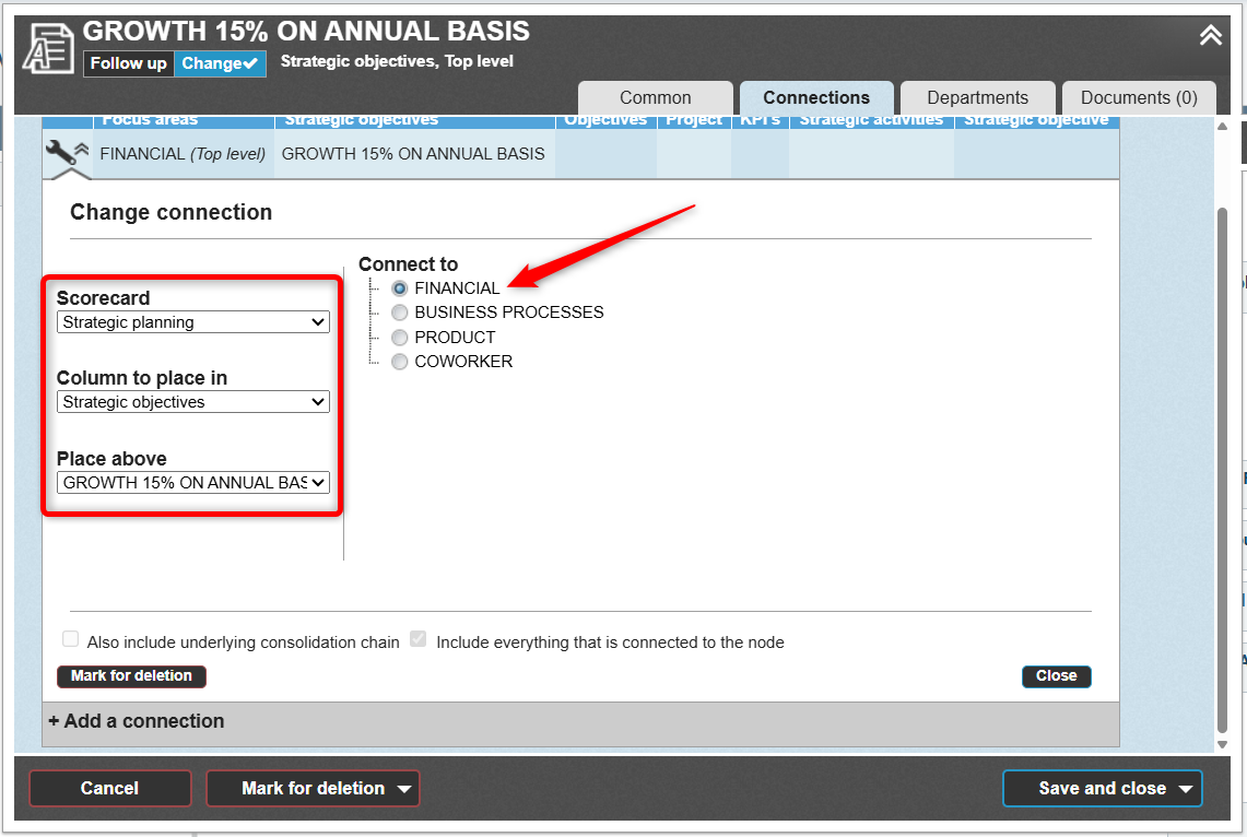 Under connections, you can also move the link to another Scorecard and another Column if the linking rules allow it, and change the order by adjusting the placement in “Place above.”