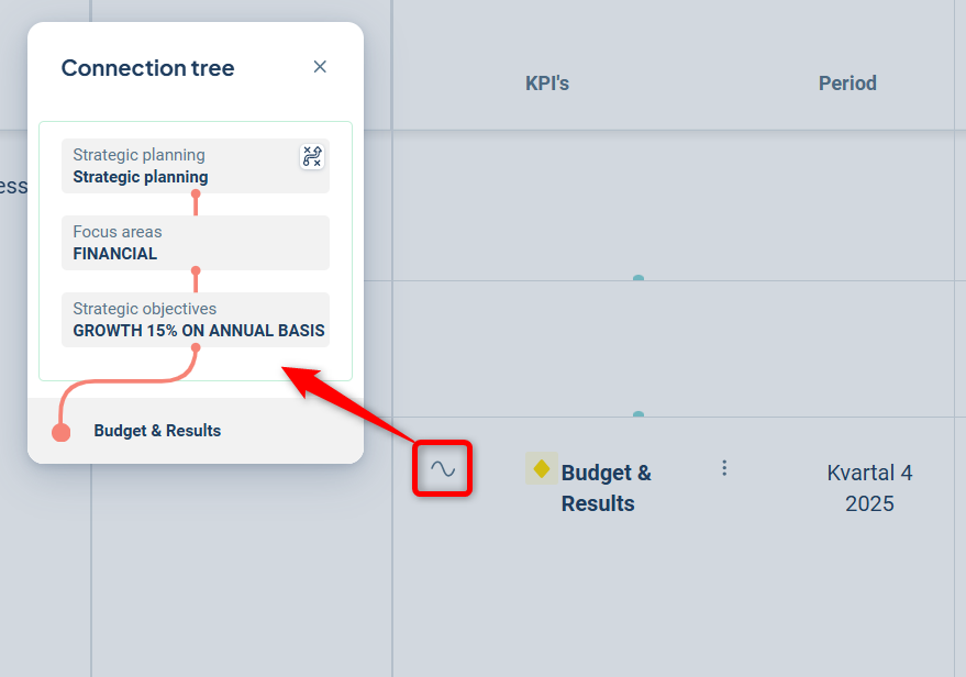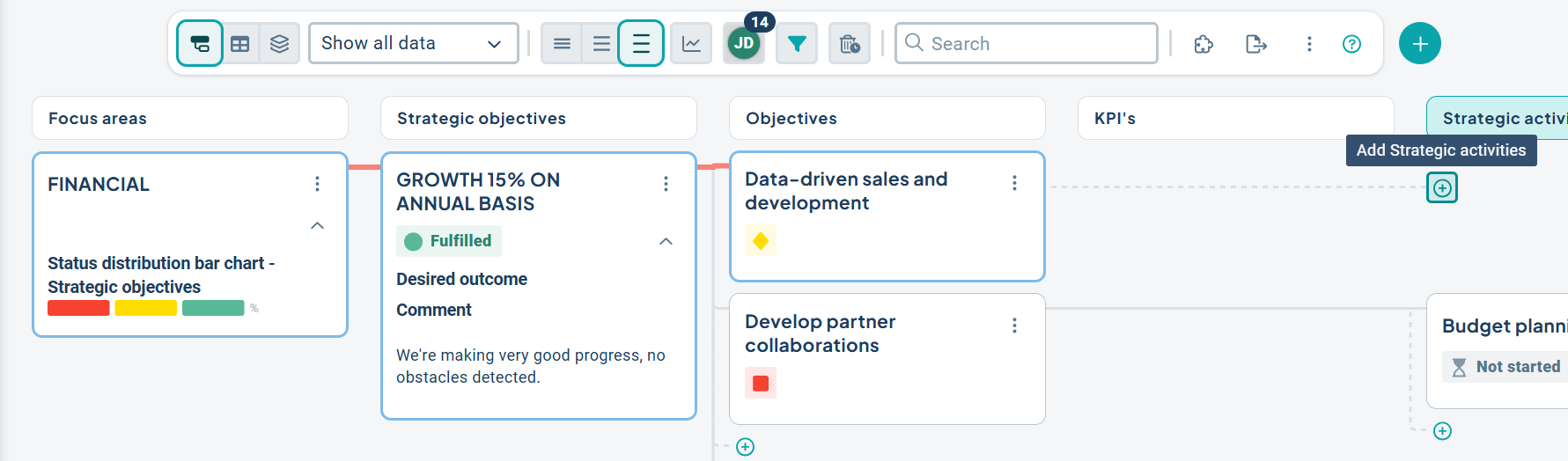 The first connection is created automatically when you create a new object. In the image below, the strategic activity will be connected to the goal indicated by the red thread when you click the plus sign to create it. Blue outlines will also appear around the connected objects.