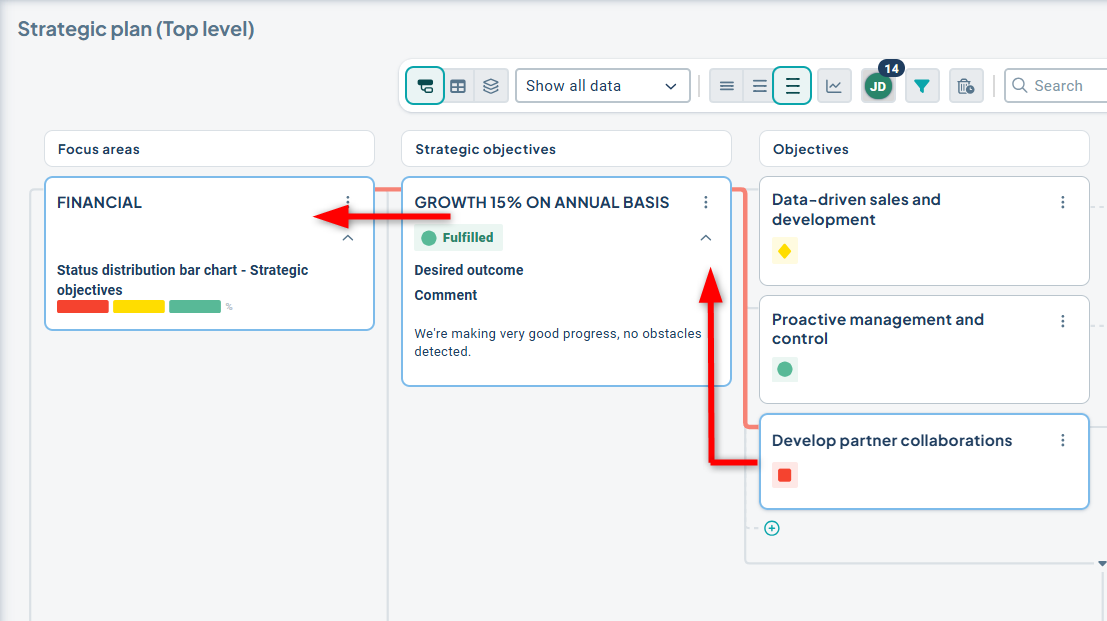 You can connect as many objects as you like to another object – for example, here are three objectives linked to one strategic objective.