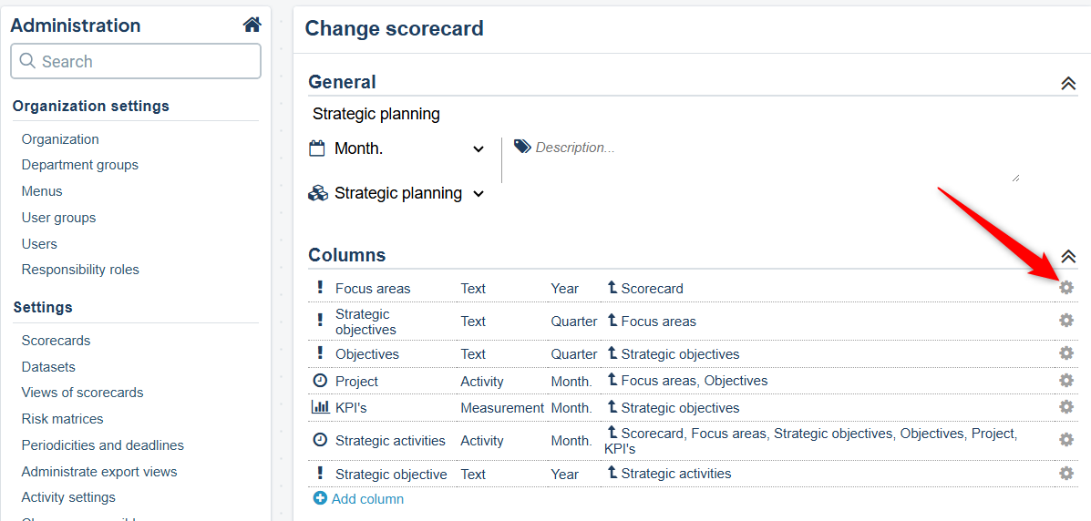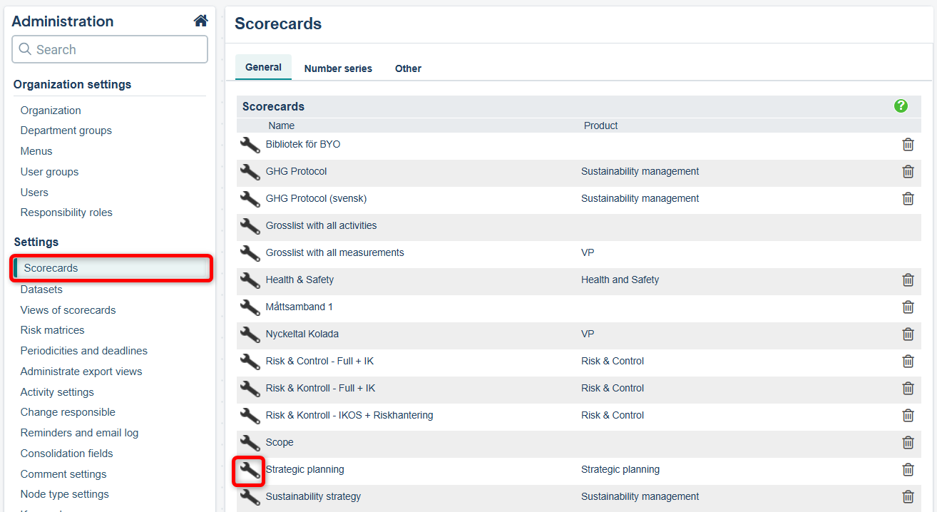 To access the settings, navigate to Administration. In the left-hand menu, click on "Scorecards". Then click the wrench icon for the scorecard where you want to adjust the settings.