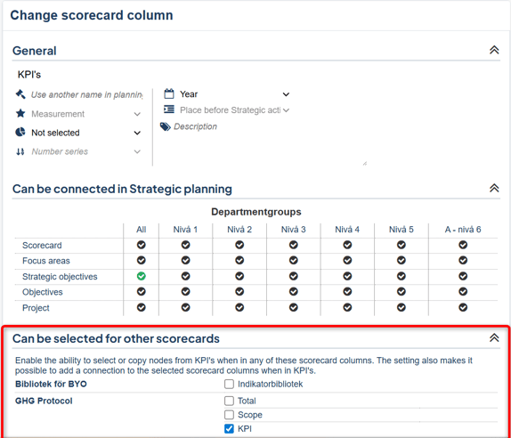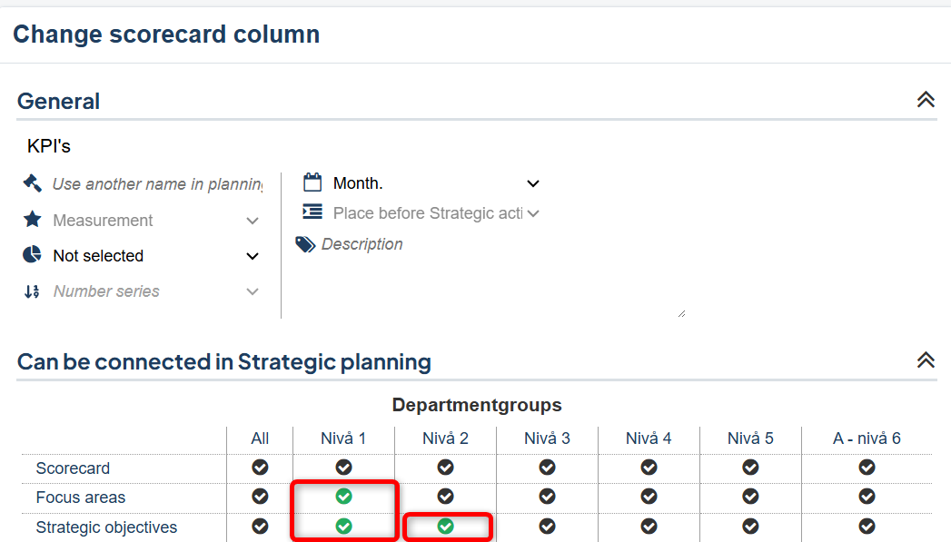 It is also possible to link an object to objects in other scorecards, which is often used for measures/key figures that are relevant across different areas — for example, in both the operational plan and the school’s systematic quality work. In this case, the scorecard settings must also allow objects to be selected into the other scorecard.