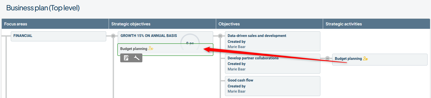 You can also link an object to several other objects by adding additional connections — for instance, linking a goal to multiple strategies that apply to the goal. In such cases, the object will be displayed in all the places it is linked. It may appear as if there are duplicates of the object, but it is actually the same object connected to multiple other objects.