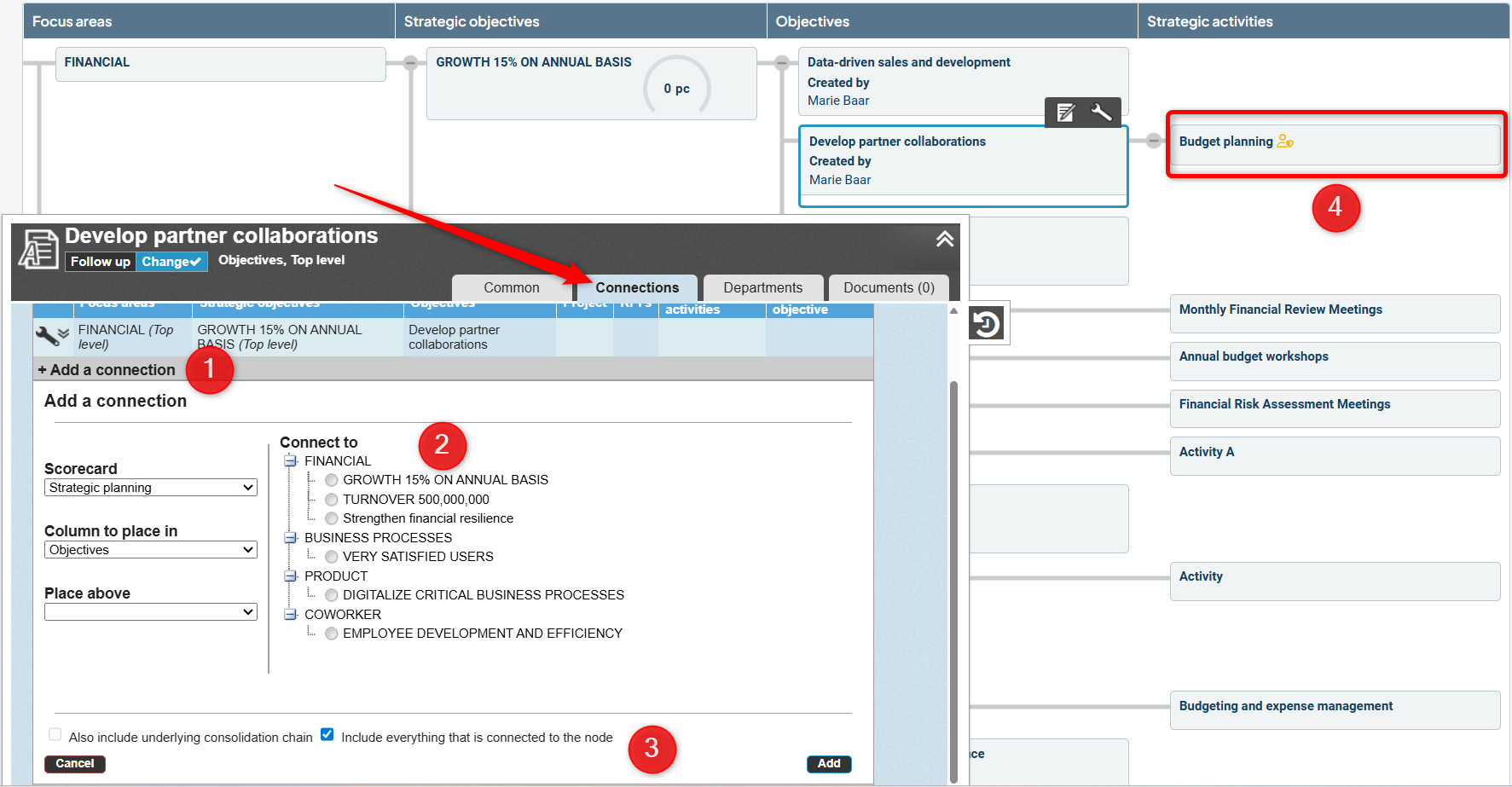 2) You can view all connections within the scorecard, including which scorecard the connection belongs to 3), and which node(s) this node is connected to 4).