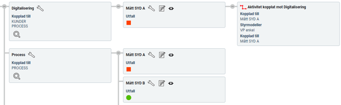 In the example below, "Measure SYD A" has two connections—one to "Digitalization" and one to "Process". This is not displayed with two lines from the same node, but rather as two separate boxes—however, it is the same node being shown.