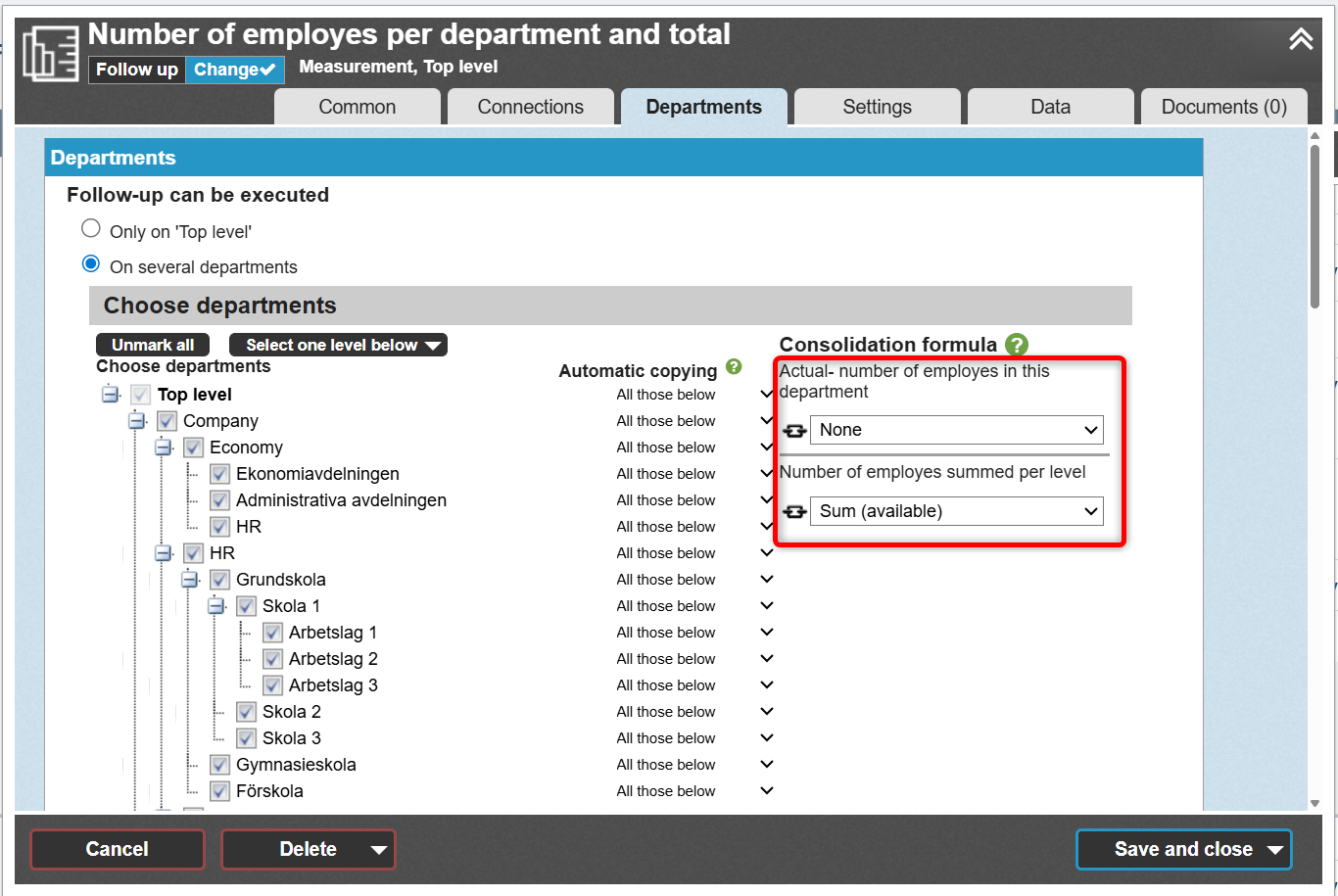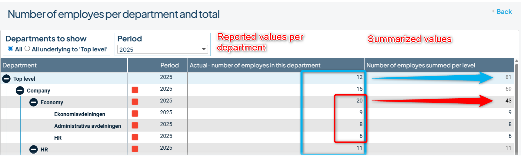 Normally, when numerical values are aggregated in Stratsys, only the lowest-level departments (the underlying units) can report, while the other departments in the tree display the sum or average from the lower levels.