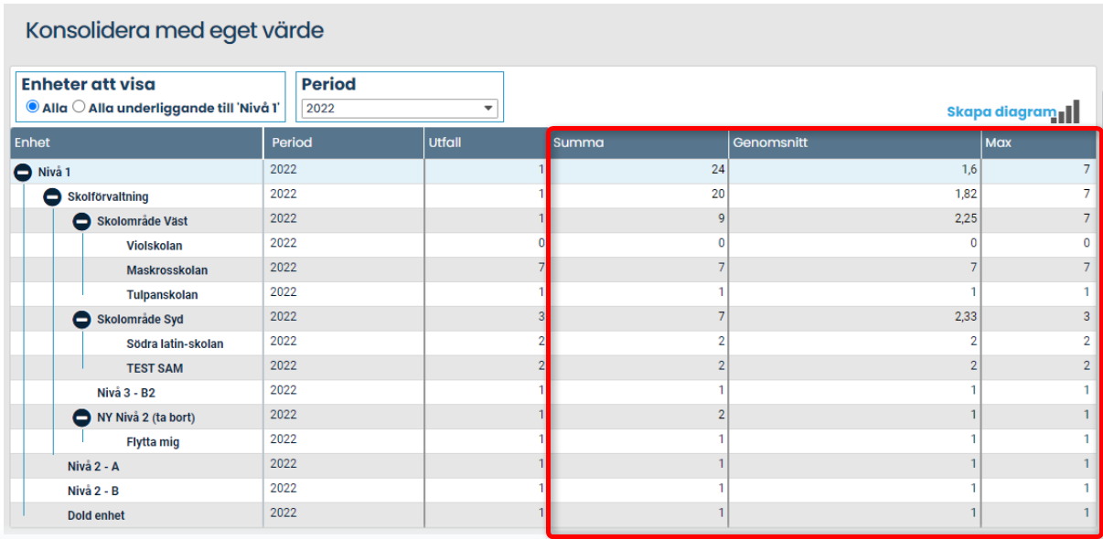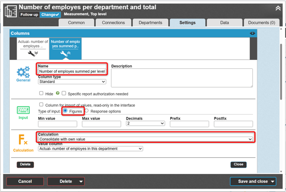 With the calculation formula consolidate with own value, all departments can report outcomes, and an additional column can sum or calculate the average of these values at all levels.