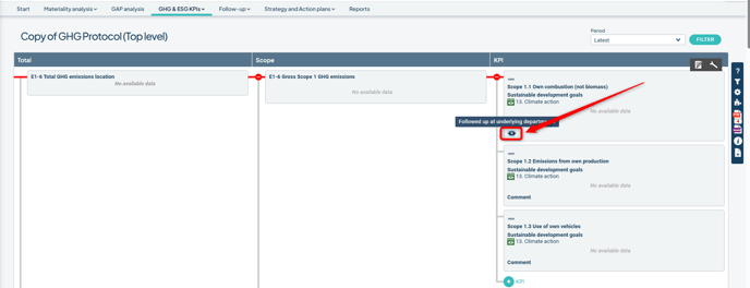 Once the attribute is activated, a new chain-shaped icon will appear in the view when there are consolidated nodes. A vertical chain indicates that the information is followed up at higher-level departments, while a horizontal chain shows that the information is followed up at lower-level departments. A department may therefore display both a vertical and a horizontal chain for certain data. Clicking the chain icon will open the consolidation view.