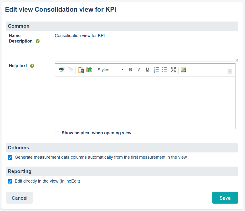 Under "Common" and "Edit," you can, for example, add a help text for the view or control whether editing via inline edit should be allowed. Don't forget to save!