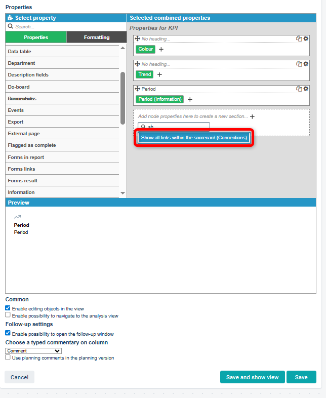 As an example, if you want to see the connections the node has on the underlying departments, you can add “Show all links within the scorecard.” You remove properties by dragging and dropping them back to the left-hand column “Select property.” Save when you're done!