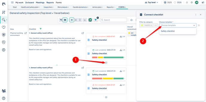 To add a new Forms checklist to your object, click the plus icon to create a link to the desired form template. A dialog will open on the right where you can select the checklist template you want.