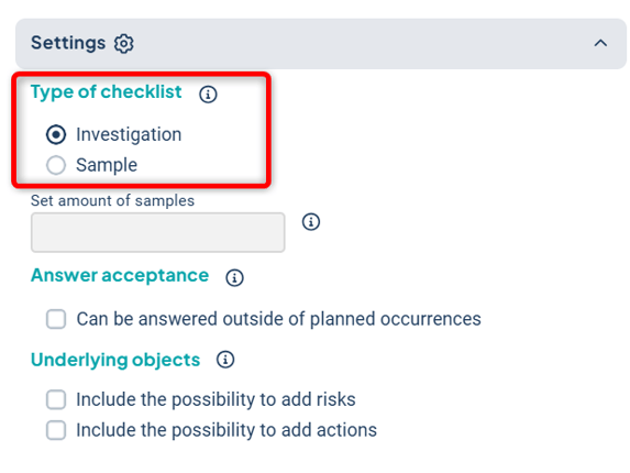 In the settings, select whether the checklist should be a investigation or a sampling. For this guide, we assume it is a investigation – follow the link to read more about the sampling checklist type.