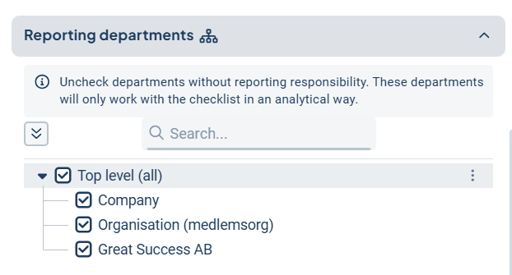 The reporting departments for the checklist are automatically set to match the department distribution of the linked object. If you want to limit which departments should receive the checklist, you can deselect the departments that should not have it.