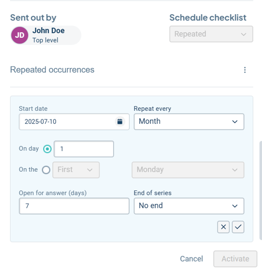 - Enter the start date and how often the checklist should be followed up (from weekly to yearly).