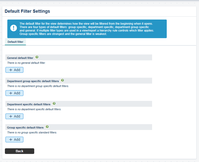 The most common setup is to use a General filter along with various Department Group–specific default filters to define how information should be displayed in the view at different organizational levels.