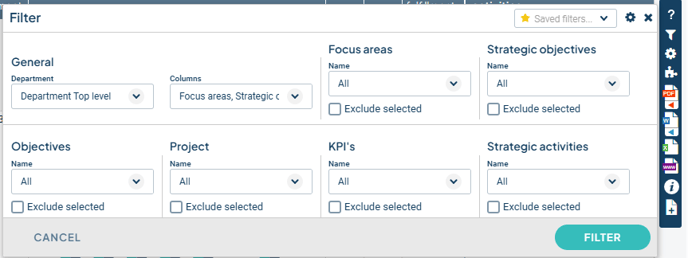It is possible to create different default filters for different department and permission groups, allowing the information to be tailored to various parts of the organization. For instance, activities may not be displayed at the top levels but only at more operational departments. See more below.