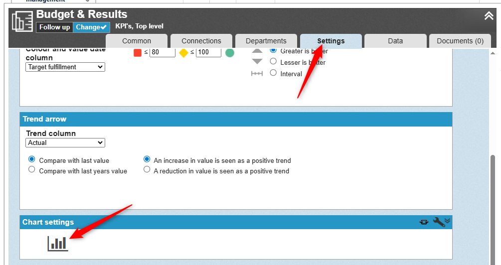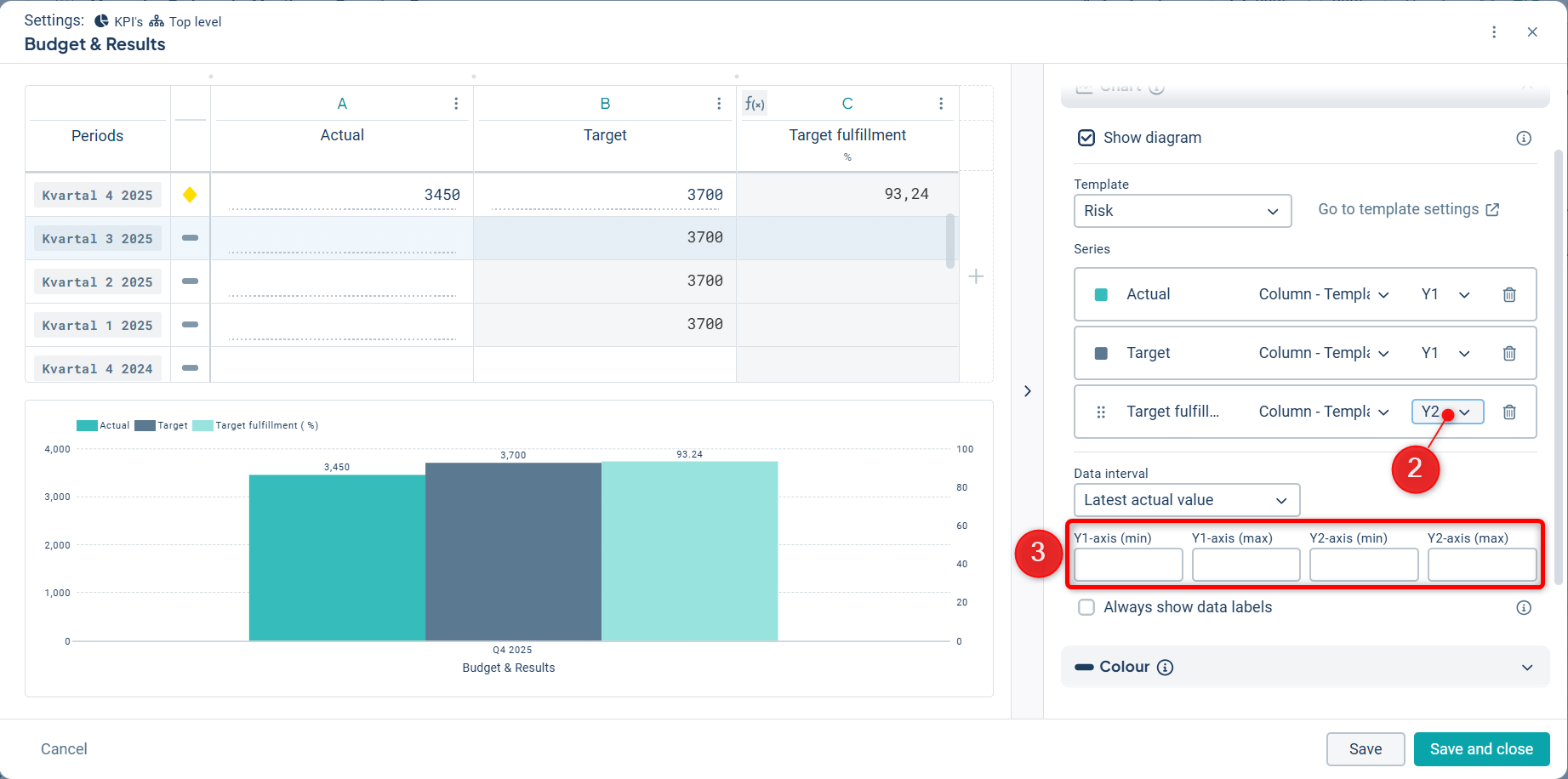 It is possible to configure dual Y-axes in measure charts, which can be useful if you want to visualize measure series with different value ranges. An example could be displaying actual values in absolute numbers and goal fulfillment in percentages in the same chart in a clear way.