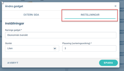 You then configure the gadget as usual, such as changing the name, sorting order, and selecting which organizational departments it should be visible to. Remember that when you add a new gadget, it is by default only visible to you—so make sure to share it with the units that need access! You can read more here: Dashboard with Gadgets