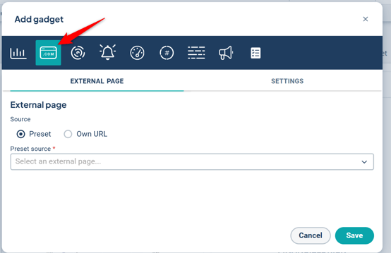 Go to the start page and click "Add gadget" in the upper right corner. Select the second tab to add an external page. In the dropdown list, all the links you've created—both static and dynamic—will be available for selection. Choose the desired link and click Save.