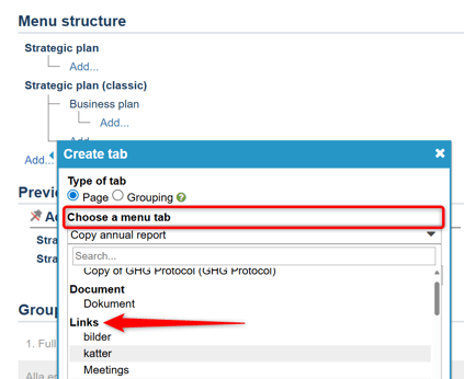 Links are used for static URLs, meaning the same content is shown regardless of the user's position in the organizational tree. To add a link, paste the URL into the field and give it a name that makes it easy to identify later.