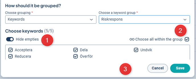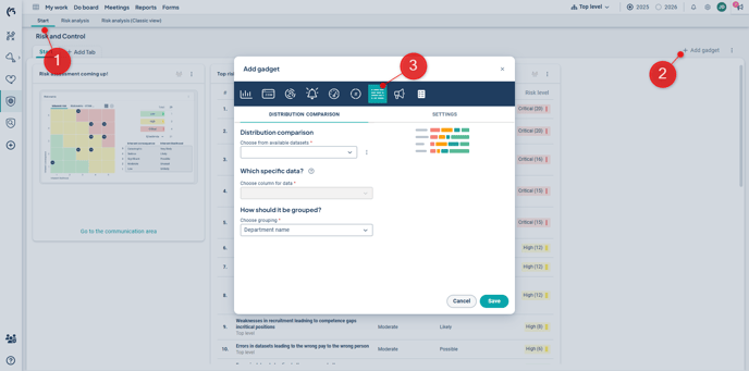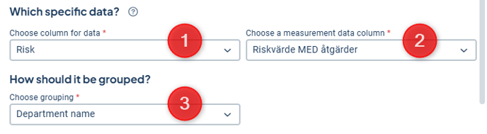 For risks: Select the column for the risks or activities you want to display the distribution for (1). For risks, the column must be of type "Risk." Then select which value in the risk you want the summary for (2) – in this example, we choose risk value. Then choose grouping (3). Read more about groupings below.