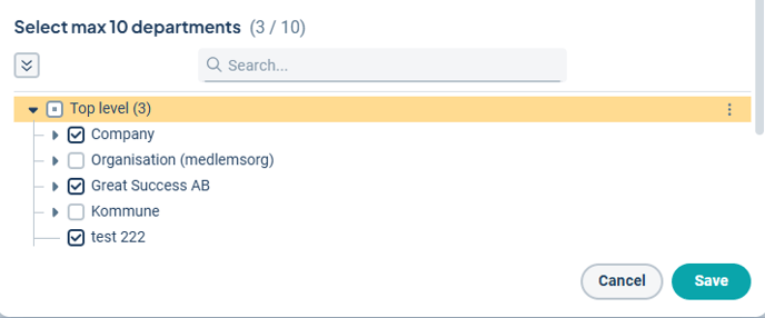 Tip! If you allow filtering by underlying units in the dataset, you do not need to check off underlying units at this stage. Instead, you can select only the most relevant departments to present directly. The underlying departments of the selected ones will automatically be displayed when the gadget’s content is filtered by underlying departments.