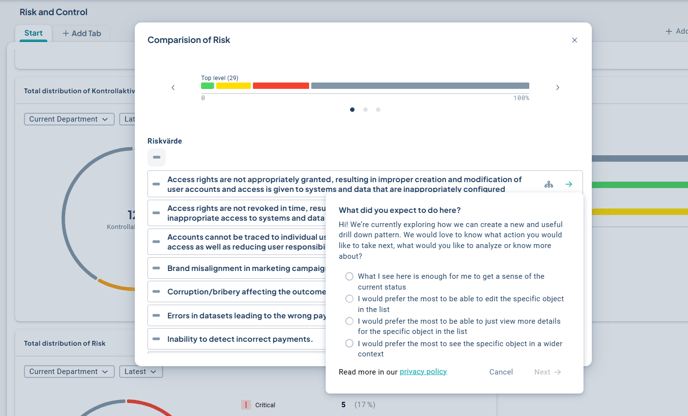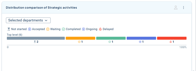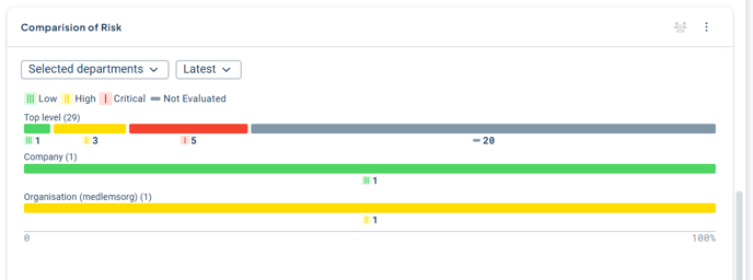 The Distribution Comparison gadget displays the distribution of risk levels, response options, or activity statuses divided by unit or keyword. You can access additional information by interacting with the gadget.