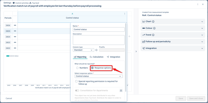For risks and response options, you can select the year for which you want to view the assessment using the year selector (since activity statuses are not periodized, this option is only available for risks and measures).