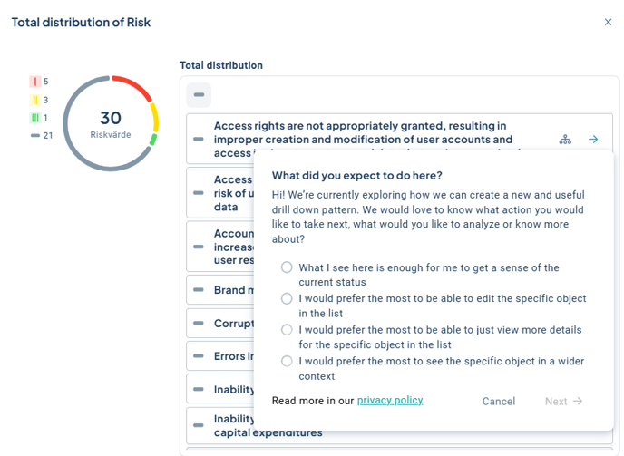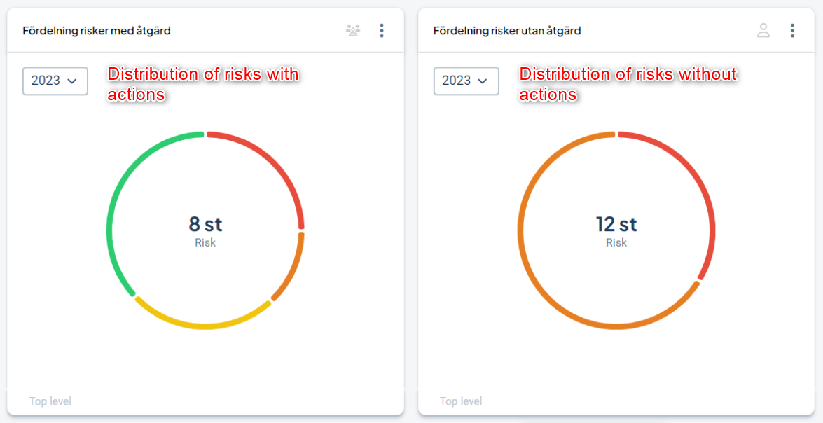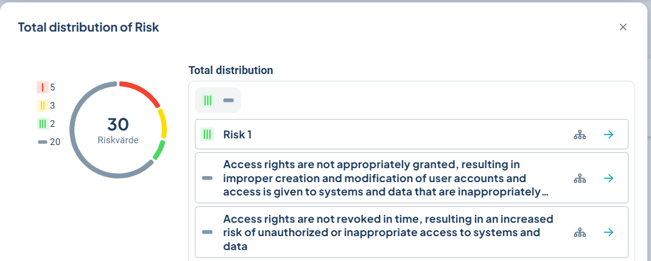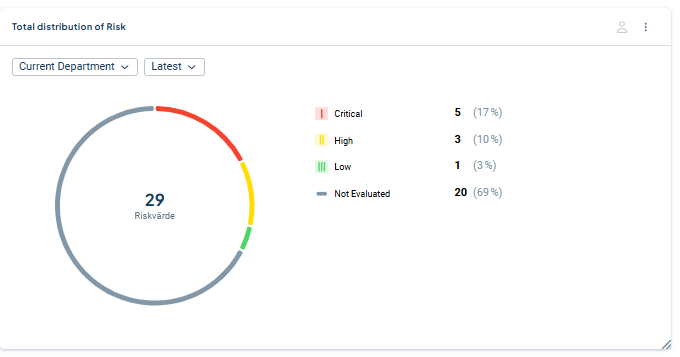 You can access more information by clicking directly in the gadget, and for example, filter by risk level color or activity status, as well as view risks or response alternatives that are unassessed or lack data.