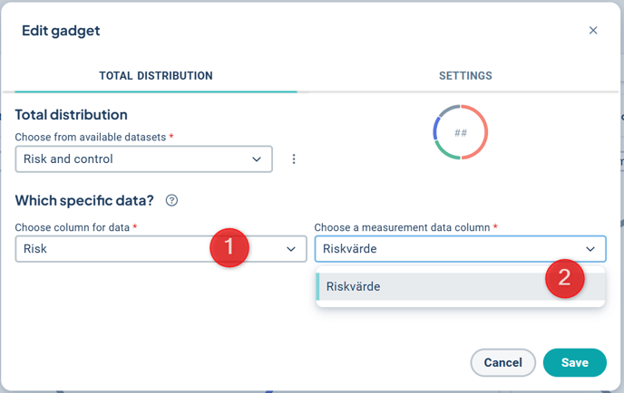 For Risks: Select the data column for the risks you want to compile (1). The column must be of the type "Risk." Then select which value of the risk you want to summarize (2).