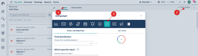 Click on Add Gadget (2) at the top right of your dashboard and then select the gadget Total Distribution (3):