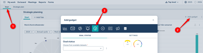 From your dashboard (1), click on Add gadget (2) and select Goal Status (3):
