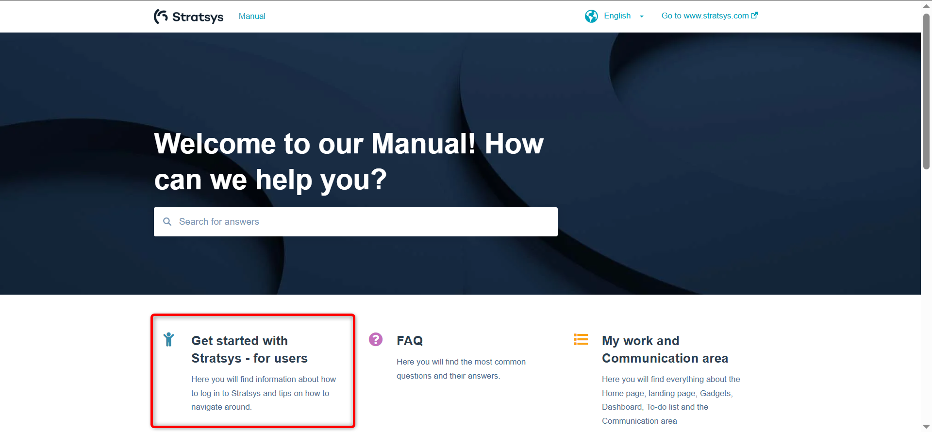 The Help Center may look slightly different depending on your user role, but you will always find our FAQ (Frequently Asked Questions), our manual, Stratsys E-Learning, and your local contact persons:
