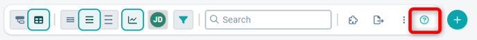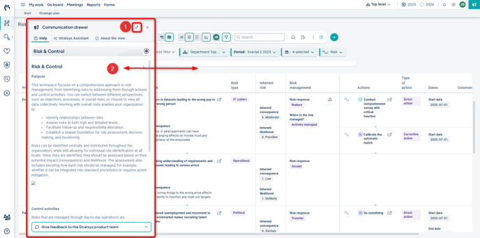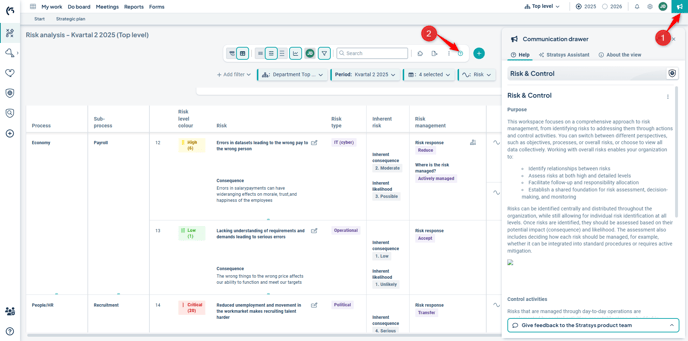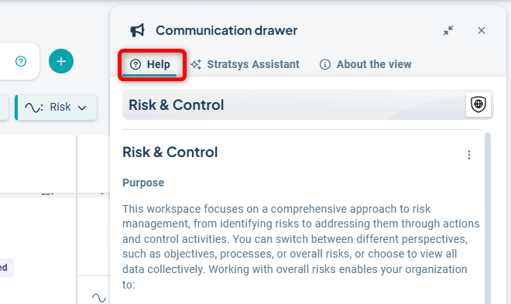 In the new view type, you’ll find the help text related to the view in the communication drawer. You can open it by clicking the megaphone (1) or the question mark (2) in the view’s toolbar.